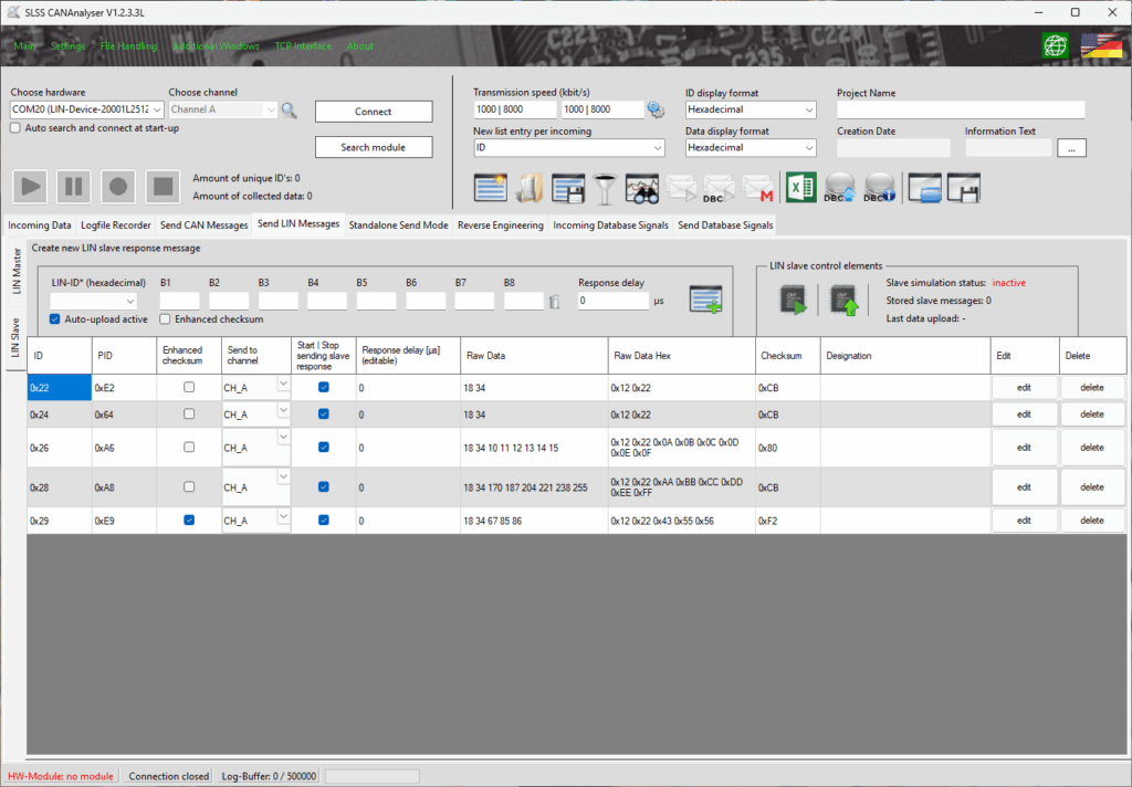In addition to master functionality, the system supports hardware-based LIN slave simulation with memory for up to 64 messages. For each response, an individual response delay can be configured, allowing realistic timing behavior and precise simulation of real LIN nodes. This enables advanced testing scenarios such as ECU integration, robustness testing, and fault analysis.